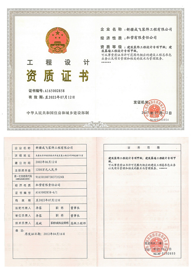 新疆成飛建設工程有限公司是一家以專注于裝飾工程領域,堅持穩健經營、持續創新、開放合作的原則,在星級賓館、高檔寫字樓、大型商場、高級餐館、娛樂設施、車站、銀行等大型室內外建筑工程(包括各類玻璃幕墻、石材幕墻、鋁板幕墻、鋼結構室內裝飾等工程)裝飾裝修...查看更多